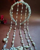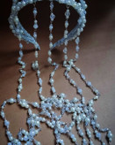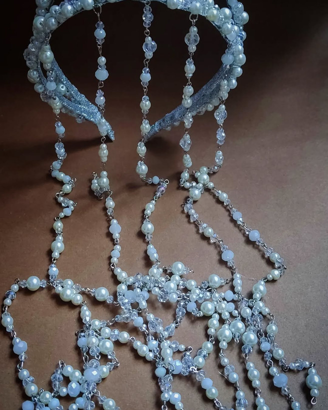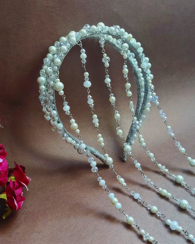 این تل به صورت تک ودولاین با آویزهای چند سایزی قابل اجراس با انتخاب مشتری با مروارید وکریستال اصلی ساخته شده تمام متریال با سیم دوخته شدن واصلا ریزش نداره آویزهای کار 50سانتیه