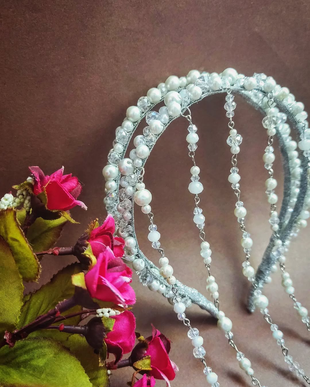 این تل به صورت تک ودولاین با آویزهای چند سایزی قابل اجراس با انتخاب مشتری با مروارید وکریستال اصلی ساخته شده تمام متریال با سیم دوخته شدن واصلا ریزش نداره آویزهای کار 50سانتیه