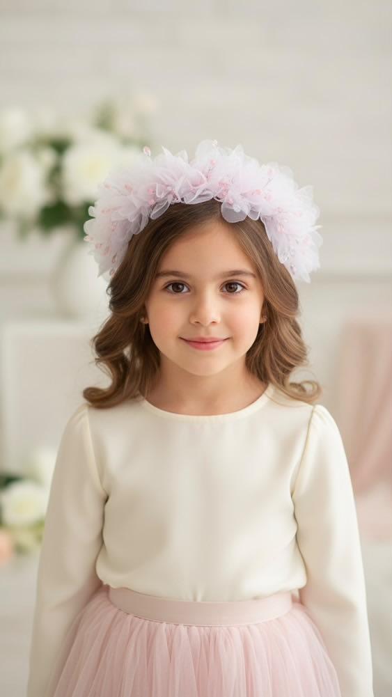تلتاج دخترانه با گلهای حریر وکریستال واشک صورتی